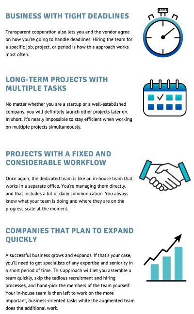 A dedicated team is a business model of collaboration when the client gets a team of professionals meticulously selected according to a specific project’s requirements. The client may decide to manage the team from his side or assign the service provider’s advisor to coordinate the communication process.